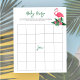 Baby shower invitation design avec flamingo rose avec frondes de feuilles de palmier vert luxuriant et fleurs d'hibiscus tropical. "Aloha Baby". Un motif à fleurs tropicales aux couleurs arrière - plans noires habille le dos de la carte.