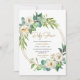Cette belle invitation au baby shower présente de belles aquarelles vertes, des fleurs blanches et une couronne d'or. Si élégant et joli ! Des articles de fête correspondants sont également disponibles. © Mini Moi Prints