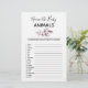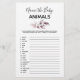 Saviez-vous qu'un bébé requin est un "chiot", et qu'un bébé kangourou est un "joey" ? Testez vos invités de baby shower à quel point ils connaissent bien les noms des bébés animaux avec ce jeu amusant! Cette Aquarelle violette Fleurs Nom du Baby shower Le jeu Bébé animal a une liste d'animaux et un espace sur lequel vos invités peuvent écrire. Demandez à vos invités d’écrire le nom propre du bébé de l’animal en face du nom de l’animal. Celui qui a le plus de noms correct gagne ! Réponse : 1.gosling, 2.duckling, 3.chick, 4.calf, 5.fawn, 6.piglet, 7.kitten, 8.calf, 9.tadpole, froglet, 10.kid, billy, 11.cub, 12.foal, colt, 13.joey, 14.puey, 15.p, 16.porcupette, 17.bunny, 18. agneau, lambine