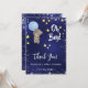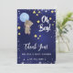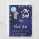Un arrière - plan bleu marine. La couleur bleue est inégale. Un ours en peluche tenant un ballon bleu étoiles et une fausse parties scintillant. Personnalisez et ajoutez le ou les nom(s) et une date à l'avant. Le nom et le texte : Oh Boy! sont écrits avec un script de style écrit main Retour : Merci note et nom(s)