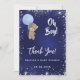 Un arrière - plan bleu marine. La couleur bleue est inégale. Un ours en peluche tenant un ballon bleu et une parties scintillant en faux argent. Personnalisez et ajoutez le ou les nom(s) et une date à l'avant. Le nom et le texte : Oh Boy! sont écrits avec un script de style écrit main Retour : Merci note et nom(s)