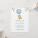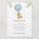 "Baby shower invitation featuring a cute bear holding a blue balloon, surrounded by stars and leaves. Text reads: 'A little hunny is on the way!' and 'Save the Date for the baby shower of Sophia and Richard, Aug 12, 7 PM.'"