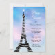 Des lumières scintillantes mettent l'accent sur la Tour Eiffel sur un arrière - plan rose et bleu aquarelle, faisant de cette invitation baby shower parisienne une invitation à la fête inspirée de Paris.
