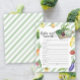 "Un bébé local est en route". Célébrez avec cette fête de baby shower à thème potager d'aquarelle ! Aquarelle concombre, oignon, aubergine, courgettes, tomates jaunes et rouges, radis, carottes, poivre chaud, poivre jaune doux, pois et chou, brocoli et betterave sur une planche à découper. Aquarelle de récolte biologique. Réponses : CRAVINGS, PLEIN, PACIFICATEUR, BOUTEILLE, LUMIÈRE NOCTURNE, LULLABY, STROLLER, ÉPIDURAL, BRÛLE, CHAISE HAUTE, SAC DE DIAPER, ÉPONSE