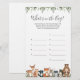 Baby shower à thème pour les animaux de bois devinez ce qui est dans la carte de jeu de sac comprend une aquarelle pour les animaux de bois illustration et aquarelle vert eucalyptus garland et élégante police manuscrite.