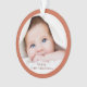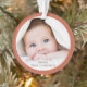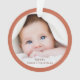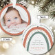 Baby's First Christmas Personalized with Name, Birthdate, and Photo Round Acrylic Keepsake Ornament... On front of our "Baby's First Christmas" keepsake ornament is the baby's photo and example text "Merry First Christmas". On the back is a whimsical hand-drawn Christmas rainbow in shades of terracotta and spruce green bordering example text that reads "My Very First Christmas on Planet Earth" followed by the baby's name and birth date. All example text and the placeholder photo can be easily revised with your own on the personalization template.