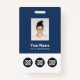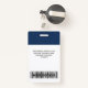 Personnalisez facilement ce badge personnalisé de nom d'employé avec photo, code de barre d'analyse et 3 logos d'entreprise multiples. Vous pouvez télécharger 3 logos d'entreprise différents, parfaits pour les partenariats et les sponsors. Un design d'entreprise simple en bleu marine et blanc entièrement personnalisable en tailles avant et arrière, sans-serif polices de base et moderne et un look professionnel et clair. Disponible avec cordon, clip métallique ou avec rétractable. Pas de commande minimum.