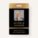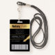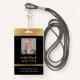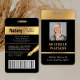 badge d'identification photo moderne en noir et or avec espace pour une photo de profil personnalisée, le titre de l'emploi, les coordonnées, les services et le code barre. Cet élégant badge de nom d'employé présente des effets arrière - plans noirs et faux or avec du texte entièrement modifiable et une photo.