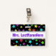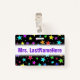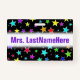 Cet amusement, caractéristiques de conception multicolores d'insigne un motif des formes d'étoile de diverses tailles et colorées une série de couleurs sur un arrière - plan noir. Il comporte également un nom personnalisé en texte coloré par pourpre dans un secteur coloré par blanc. Un insigne comme ceci a pu peut-être être porté par un professeur, un éducateur, un tuteur ou un professeur pendant les semaines tôt d'une année scolaire ou d'un cours. Il pourrait aider les étudiants à apprendre et se rappeler le nom de leur professeur. [~Z0000175]