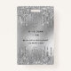Un badge moderne, élégant et glamour pour une fête d'anniversaire de 21e (ou tout âge). Un arrière - plan à l'aspect métallique faux argent avec parties scintillant faux argent goutte à goutte, la peinture goutte à goutte. Personnalisez et ajoutez un nom. Le nom est écrit avec un script de style moderne écrit à la main avec des swashes. Le texte : VIP Numéro 21 est écrit en noir. Pour que les swashes ne suppriment que le nom de l'échantillon, laissez les espaces ou émoticônes devant et après le nom. Retour : détails de votre fête.
