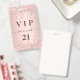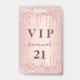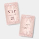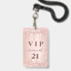 Un badge moderne, élégant et glamour pour une fête d'anniversaire de 21e (ou tout âge). Un faux or rose à l'aspect métallique arrière - plan avec or rose et parties scintillant goutte à goutte, la peinture goutte à goutte. Personnalisez et ajoutez un nom. Le nom est écrit avec un script de style moderne écrit à la main avec des swashes. Le texte : VIP Numéro 21 est écrit en or rose foncé. Pour que les swashes ne suppriment que le nom de l'échantillon, laissez les espaces ou émoticônes devant et après le nom. Retour : détails de votre fête.