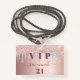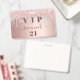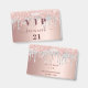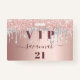 Un badge moderne, élégant et glamour pour une fête d'anniversaire de 21e (ou tout âge). Un faux rose or à l'aspect métallique arrière - plan avec un élégant or rose et parties scintillant faux argent goutte à goutte, la peinture goutte à goutte. Le nom est écrit avec un rose moderne couleur or foncé écriture de style manuscrit avec des swashes. Avec le texte : VIP Numéro 21 est écrit en couleur dorée. Pour que les swashes ne suppriment que le nom de l'échantillon, laissez les espaces ou émoticônes devant et après le nom.