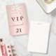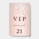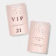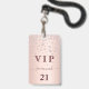 Un badge moderne, élégant et glamour pour une fête d'anniversaire de 21e (ou tout âge). Un faux rose or à l'aspect métallique arrière - plan avec des faux diamants en or rose. Le nom est écrit avec un rose moderne couleur or foncé écriture de style manuscrit avec des swashes. Avec le texte : VIP Numéro 21 est écrit en couleur dorée. Pour que les swashes ne suppriment que le nom de l'échantillon, laissez les espaces ou émoticônes devant et après le nom.