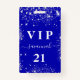Un badge moderne, élégant et glamour pour une fête d'anniversaire de 21e (ou tout âge). Un arrière - plan bleu royal avec de la poussière de parties scintillant en faux argent. Personnalisez et ajoutez un nom. Le nom est écrit avec un script de style moderne écrit à la main avec des swashes. Texte : VIP Numéro 21. Pour que les swashes ne suppriment que le nom de l'échantillon, laissez les espaces ou émoticônes devant et après le nom. Retour : détails de votre fête.