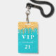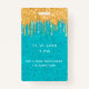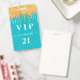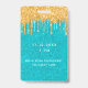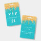 Un badge moderne, élégant et glamour pour une fête d'anniversaire de 21e (ou tout âge). Un arrière - plan turquoise, vert, parties scintillant avec fausse parties scintillant d'or goutte à goutte, la peinture goutte à goutte. Personnalisez et ajoutez un nom. Le nom est écrit avec un script de style moderne écrit à la main avec des swashes. Texte : VIP Numéro 21. Pour que les swashes ne suppriment que le nom de l'échantillon, laissez les espaces ou émoticônes devant et après le nom. Retour : détails de votre fête.