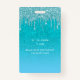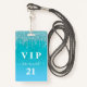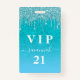 Un badge moderne, élégant et glamour pour une fête d'anniversaire de 21e (ou tout âge). Un turquoise, vert, bleu dégradé arrière - plan de parties scintillant avec fausse parties scintillant goutte à goutte, la peinture goutte à goutte. Personnalisez et ajoutez un nom. Le nom est écrit avec un script de style moderne écrit à la main avec des swashes. Texte : VIP Numéro 21. Pour que les swashes ne suppriment que le nom de l'échantillon, laissez les espaces ou émoticônes devant et après le nom. Retour : détails de votre fête.