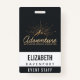 badge de nom personnalisé avec une illustration de couleur or sur un arrière - plan noir-gris. Conçu avec une illustration d'une montagne avec les rayons de soleil brillant vers l'extérieur de derrière. La typographie dit : Aventure explorer la découverte de rêve.