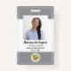 Balise de nom de l'employé avec modèle photo. Badge vertical en gris et blanc avec une place en bas pour le logo de l'entreprise. Ce badge a une photo de premier plan avec le nom sous en texte imprimé noir. Incluez également plus d'informations, jusqu'à trois lignes, en texte imprimé plus petit. Des bandes grises foncées en haut et en bas avec un centre blanc. Design minimaliste et simple qui fonctionne pour toute entreprise ou entreprise.