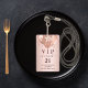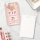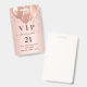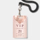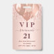 Un badge moderne, élégant et glamour pour une fête d'anniversaire pour les 21 ans (ou tout âge). Un fond dégradé rose doré avec des gouttes de faux strass et un effet de peinture qui coule. Avec le texte : VIP. Personnalisez et ajoutez le nom, l'âge, l'adresse/date. Le nom est écrit avec une police manuscrite de style dark rose doré moderne avec des fioritures.