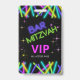 Une bordure de bâtons de lumière éparpillés dans un ensemble de couleurs de néon lumineux ajoute un élément amusant à cette invitation de style badge Bar Mitzvah. Ajoutez les détails de l'événement à l'envers à l'aide du modèle fourni. Cherchez ID991 pour voir la coordination de l'invitation et d'autres fournitures de partie avec cette conception colorée.
