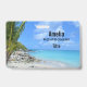 Name badge with a scenic tropical photograph. A secluded beach with white sand and turquoise water.