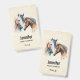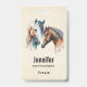 Nom badge avec un magnifique dessin aquarelle. Avec une paire de chevaux, brun et blanc. Tête et cou visibles avec de la peinture goutte le long de la base de leur cou. L'ambiance du sud-ouest.
