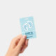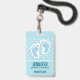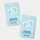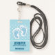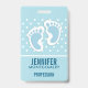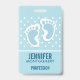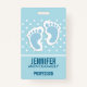 Insigne de nom avec une image charmante des empreintes de bébé bleu avec un contour blanc épais. Pois blancs sur un arrière - plan bleu bébé derrière l'illustration.