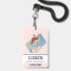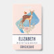 Nom badge avec un joli cerf brun avec un dos tacheté blanc. Un petit oiseau assis sur le dos du cerf. Un joli bouquet floral avec des roses aquarelles et des feuilles vert olive clair sous les pieds du cerf. Un rectangle bleu aquarelle derrière l'image. Arrière - plan coloré à la pêche.