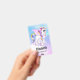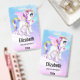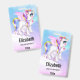badge de nom personnalisé avec l'image d'une licorne aux grands yeux bleus, ailes roses et crinière arc-en-ciel et queue. Kawaii mignon.