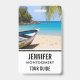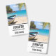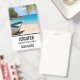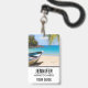 Nom badge avec une scène de plage tropicale idyllique. Eau cristalline bleu turquoise et plage de sable brun doux. Des feuilles de palmiers accrochés au-dessus. Un vieux bateau à rames en bois est installé sur la plage. Un paysage serein et paisible.