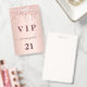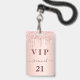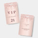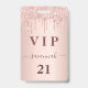 A modern, stylish and glamorous badge for a 21st (or any age) birthday party. A faux rose gold metallic looking background with an elegant faux rose gold glitter drip, paint drip look. The name is written with a modern dark rose gold colored hand lettered style script with swashes. With the text: VIP Number 21 is written in a golden color. To keep the swashes only delete the sample name, leave the spaces or emoji's in front and after the name.