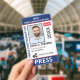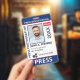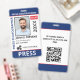 Medium sized 3"x5" vertical press ID with blue and red as accent colors. Add photo, your news publication logo, the reporter's name, title, the badge ID number and more. This Press ID is in a slightly larger size for easy visibility. Add your QR code to the back as well.