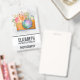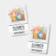 Nom badge avec une aquarelle illustrant une caméra orange et un bouquet floral posé sur le dessus. Les fleurs du bouquet sont rose clair et orange avec des feuilles verts, un joli arrangement floral.