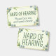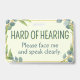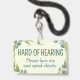 This badge features the slogan 'Hard of Hearing' surrounded by a wreath of eucalyptus leaves, on a pale green background. Below it gives specific instructions on how to interact with you. Default is 'please face me and speak clearly.' You can edit the text and colors as needed. 🍃 For more useful deafness accessories, visit my store Zazzle.com/Elder_Vitality 🍃 For custom orders, message me on Zazzle