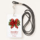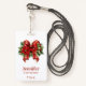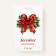 Nom badge avec un arc de Noël festif en rouge et or. Entourée de fleurs de poinsettia, de décorations de pin et de Noël.