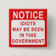 Ce badge de protestation amusant est juste la chose pour faire rire les gens. Disponible sur d'autres produits, ce badge est en forme de panneau et dit : AVIS, DES IDIOTS PEUVENT ÊTRE VUS DANS CE GOUVERNEMENT. - Un drôle de signe politique qui dit l'évidence! Super à envoyer au premier ministre et à d'autres politiciens. Je suis sûr qu'ils vont rire !