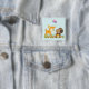 Bouton avec une jolie illustration montrant un cerf de bébé et un petit écureuil tenant une glande et un papillon volant au-dessus de leur tête. Ces adorables créatures boisées se tiennent debout sur une herbe avec quelques champignons fantaisistes à leurs pieds. Arrière - plan bleu clair.