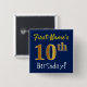 Ce simple design de bouton carré comporte un message comme "10e anniversaire de prénom!", avec le "10e" avec un faux/imitation de couleur dorée, sur un arrière - plan de couleur bleue. Le nom peut être personnalisé. Des boutons comme ceux-ci pourraient être portés par les invités à une fête d'anniversaire pour quelqu'un qui célèbre son dixième anniversaire, où la fête se déroule dans un grand quartier avec beaucoup d'autres personnes présentes (comme un parc municipal ou un parc à thème). [~Z0000164]