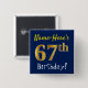 Ce simple design de bouton carré comporte un message comme "Nom-Voici 67e anniversaire!", avec le "67e" avec un faux/imitation de couleur dorée, sur un arrière - plan de couleur bleue. Le nom peut être customisé. Des boutons comme ceux-ci pourraient être portés par les invités à une fête d'anniversaire pour quelqu'un qui célèbre son soixante-septième anniversaire, où la fête se déroule dans un grand espace avec beaucoup d'autres personnes présentes (comme un parc municipal ou un parc à thème). [~Z0000164]