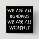 Description de l'image : Grandement blanc lettrage lisant, "Nous sommes tous des fardeaux. Nous en valons tous la peine." Ce message est censé contrebalancer l'idée que personne n'est un fardeau, ou qu'être un fardeau est une mauvaise chose. Surtout en tant que personne handicapée, on a l'impression d'être un fardeau pour les gens qui vous entourent. Et parfois c'est vrai, mais ce n'est pas une mauvaise chose. C'est acceptable d'être un fardeau, parce que tout le monde est à un moment ou à un autre, et vous valez l'effort.