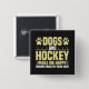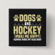 Bouton de thème de hockey avec texte qui lit Chiens et Hockey Me rendre heureux Humains Faire ma tête mal! Il y a aussi des bâtons de hockey et des empreintes de pattes de chiens!