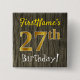 Ce design simple de bouton carré comporte un message comme « 27e anniversaire de FirstName ! », avec le « 27e » ayant une apparence de couleur dorée fausse/imitée, sur un fond à motif de faux bois. Le nom peut être personnalisé. Des boutons comme ceux-ci pourraient éventuellement être portés par des invités à une fête d'anniversaire pour quelqu'un qui célèbre son vingt-septième anniversaire, où la fête se déroule dans une grande zone avec beaucoup d'autres personnes présentes (comme un parc municipal ou un parc d'attractions). [~Z0000167]