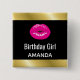 Bouton fille d'anniversaire avec une illustration avec des lèvres roses chaudes. Image audacieuse et vibrante. Faux dégradé or bordures le long du haut et du bas. Placez-vous sur un arrière - plan noir.