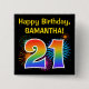Ce design amusant et dynamique de boutons propose un motif coloré inspiré par des feux d'artifice festifs, ainsi que le numéro "21" avec un spectre multicolore inspiré de l'arc-en-ciel ou un motif dégradé. Il comporte également un nom et un message d'événement personnalisables, comme un message d'anniversaire "Joyeux anniversaire". Un bouton comme celui-ci peut être porté par les invités à une fête d’anniversaire qui se tient pour célébrer le vingt et unième anniversaire de quelqu’un. [~Z0000334]