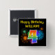 Ce design amusant et dynamique de boutons présente un motif coloré inspiré par des feux d'artifice festifs éclatants, ainsi que le numéro "4" avec un spectre multicolore inspiré arc-en-ciel ou motif dégradé. Il comporte également un nom et un message d'événement personnalisés, comme un message d'anniversaire "Joyeux anniversaire". Un bouton comme celui-ci peut être porté par les participants à une fête d’anniversaire organisée pour célébrer le quatrième anniversaire de quelqu’un. [~Z0000334]