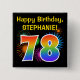 Ce design amusant et dynamique de boutons présente un motif coloré inspiré par des feux d'artifice festifs éclatants, ainsi que le numéro "78" avec un arc-en-ciel multicolore comme spectre ou motif dégradé. Il comporte également un nom personnalisé et un message d'événement, comme un message d'anniversaire "Joyeux anniversaire". Un bouton comme celui-ci peut être porté par les participants à une fête d’anniversaire qui se tient pour célébrer le soixante-dix-huitième anniversaire de quelqu’un. [~Z0000334]