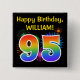 Ce design amusant et dynamique de boutons présente un motif coloré inspiré par des feux d'artifice festifs éclatants, ainsi que le numéro "95" avec un spectre multicolore d'inspiration arc-en-ciel ou motif dégradé. Il comporte également un nom personnalisé et un message d'événement, comme un message d'anniversaire "Joyeux anniversaire". Un bouton comme celui-ci pourrait être porté par les invités à une fête d’anniversaire qui se tient pour célébrer le quatre-vingt-quinzième anniversaire de quelqu’un. [~Z0000334]