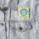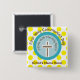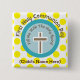 Mon premier bouton de communion, personnalisable avec le nom de l'enfant. Pois jaunes avec centre turquoise et croix.