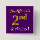 Ce simple design de bouton carré comporte un message comme "FirstName’s 2nd Birthday!", avec le "2nd" ayant un look de couleur fausse/imitation or, sur un arrière - plan de couleur violette. Le nom peut être personnalisé. Des boutons comme ceux-ci pourraient être portés par les invités à une fête d'anniversaire pour quelqu'un qui célèbre son deuxième anniversaire, où la fête se déroule dans un grand quartier avec beaucoup d'autres personnes présentes (comme un parc municipal ou un parc à thème). [~Z0000166]