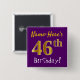 Ce simple design de bouton carré comporte un message comme "Nom-Voici le 46e anniversaire!", avec le "46e" ayant un faux/imitation de couleur dorée, sur un arrière - plan de couleur violette. Le nom peut être customisé. Des boutons comme ceux-ci pourraient être portés par les invités à une fête d'anniversaire pour quelqu'un qui célèbre son quarante-sixième anniversaire, où la fête se déroule dans un grand espace avec beaucoup d'autres personnes présentes (comme un parc municipal ou un parc à thème). [~Z0000166]